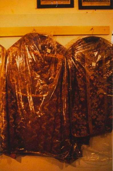 soie (polychrome, jaune, violet) ; fil métal : or ; toile (rose, doublage) ; dentelle (décor) ; taffetas : broché