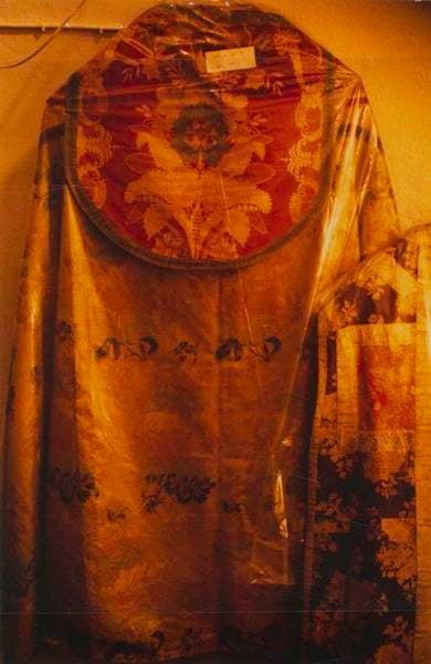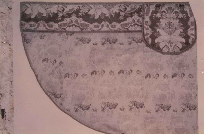 Chape en soie jaune, lampas, du milieu 17ème siècle ; orfrois et chaperon en damas remontés sur la chape au 18ème siècle. Chape jaune en lampas, liseré, 2 lats de lancé, lattes dont un interrompu, fond satin de 8, décor en soie polychromes. Orfrois et chaperon en damas satin de 5 lancé, broché. Galon tissé en soie jaune, filé et trait or oxydés. Doublure en toile de lin.
