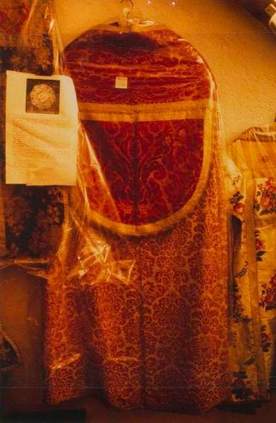 Chape rouge en lampas à décor doublé étoffé en soie et lin (trame de fonds). Chaperon et orfrois en brocatelle satin de 8, décrochement 3 : chaîne en soie rouge, trame en lin jaune, trame supplémentaire lancée en soie jaune. Galon tissé en lin et soie rose et vert. Doublure de la chape en toile de lin apprêté vieux rose et blanc. Doublure du chaperon en toile de lin jaune.
