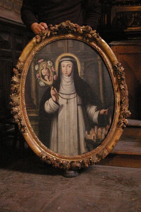 Tableaux ovales, dotés d'un cadre en bois sculpté ; le cadre du tableau représentant sainte Catherine de Sienne est doré.