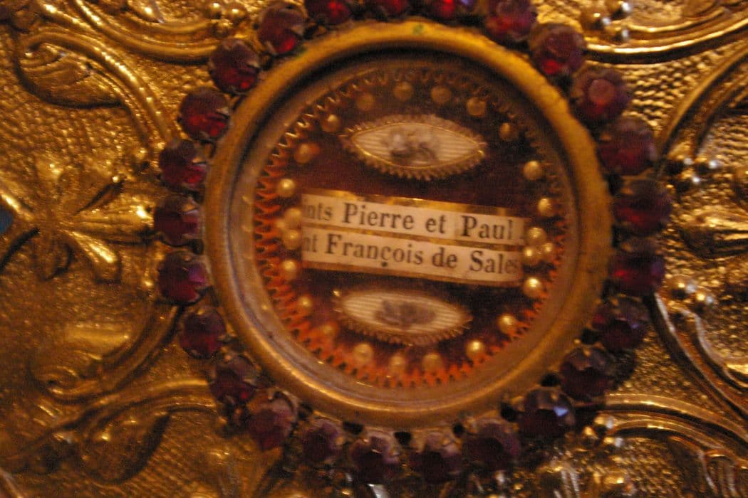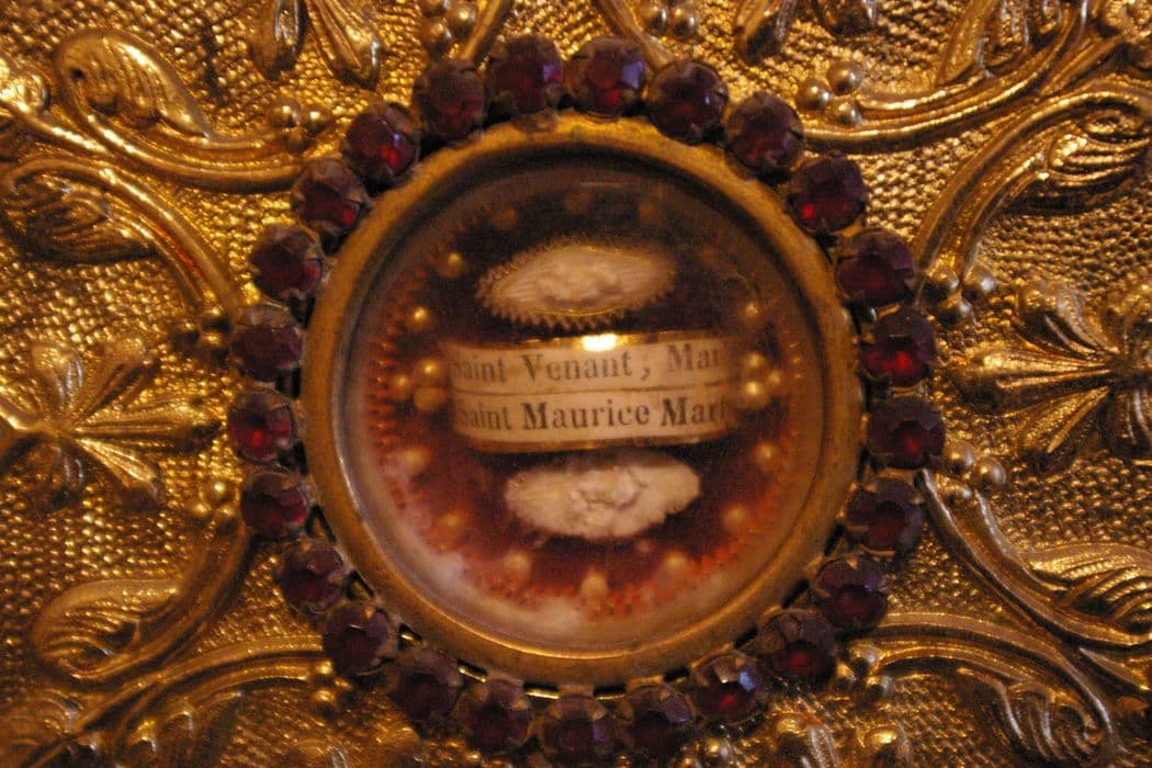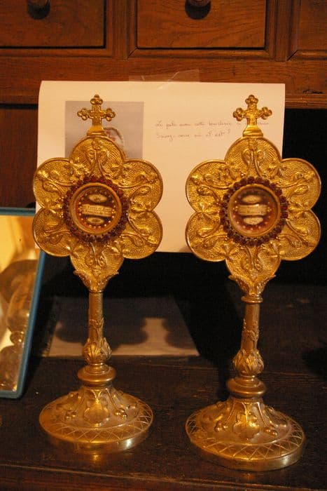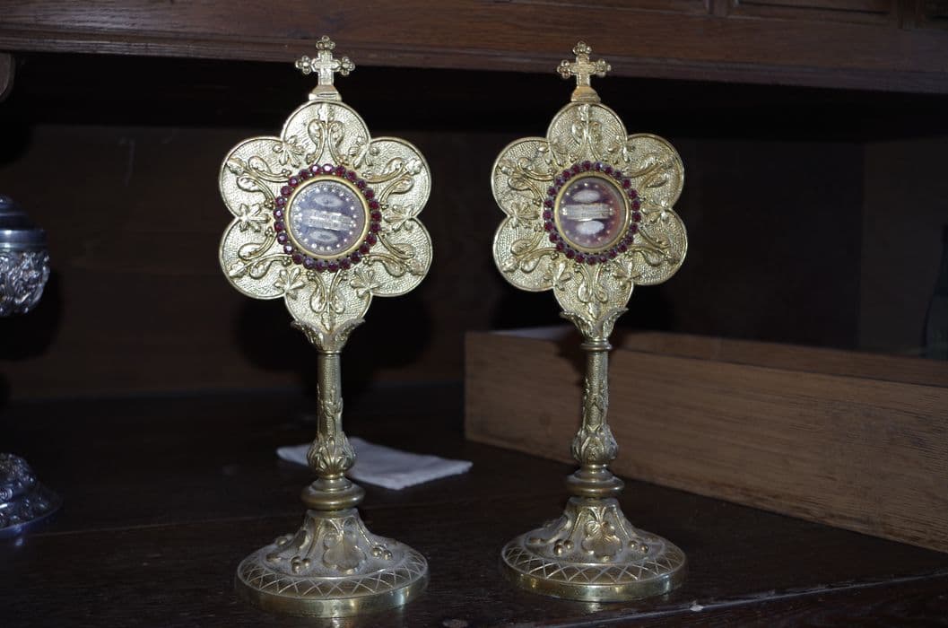 Reliquaires en métal doré avec incrustation de pierres rouges.