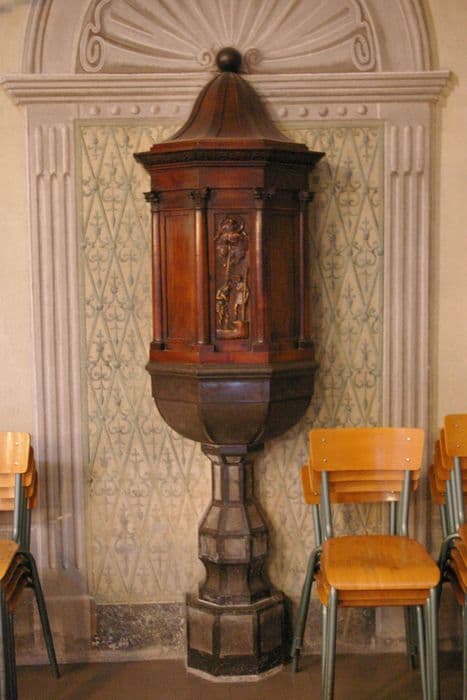 Un relief représentant le Baptême du Christ est inclus dans l'architecture des fonts baptismaux, petit édicule à pans coupés porté par un pied de marbre. Le relief est placé au centre, entre deux colonnettes.