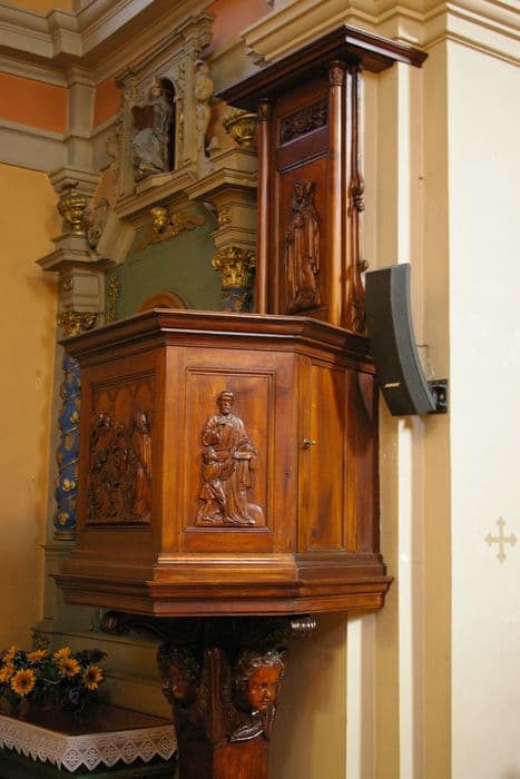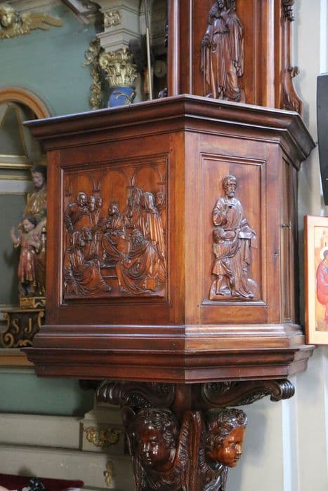 La cuve de la chaire est de forme octogonale et s'appuie sur un pied orné de trois têtes d'anges ailées et de volutes. Le dossier est surmonté d'une croix sans abat-voix. Le panneau central de la cuve est orné d'un bas-relief représentant Jésus parmi les Docteurs. De part et d'autre sur les côtés sont figurés les Evangélistes saint Jean, saint Marc et saint Matthieu. Saint Luc semble manquer. Sur le dossier de la chaire est représenté le Bon Pasteur.