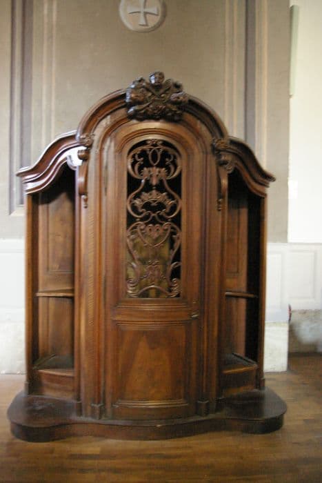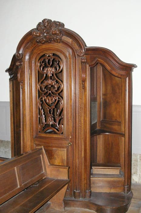 La porte du confessionnal est ajourée, décorée de rinceaux de feuillage stylisés.