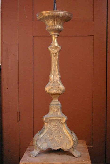 Le chandelier est composé d'un piètement triangulaire et d'une tige moulurée.