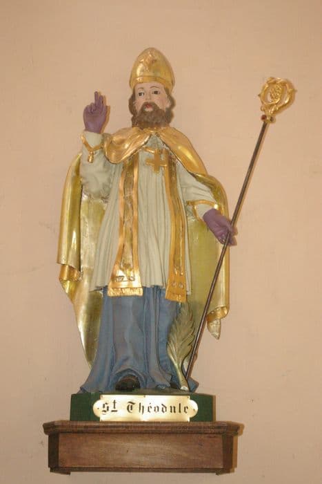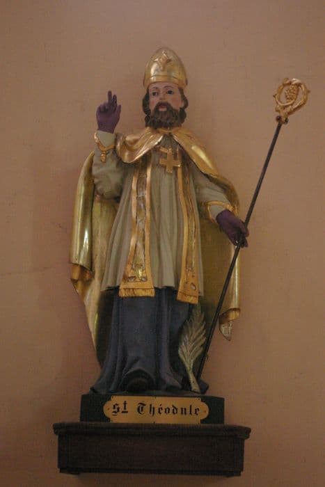 Saint Théodule est revêtu des habits épiscopaux, ganté, mitré et tenant la crosse dans la main gauche. De la main droite, il fait le geste de bénédiction. Le saint est vêtu en soldat, portant l'armure de la légion romaine. Il tient la lance dans la main droite et de la gauche présente la palme des martyrs.