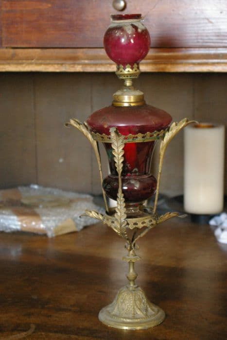 Le verre de la lampe, rouge, est inserré dans une structure décorative de laiton. Quatre palmettes très fines retiennent le verre.