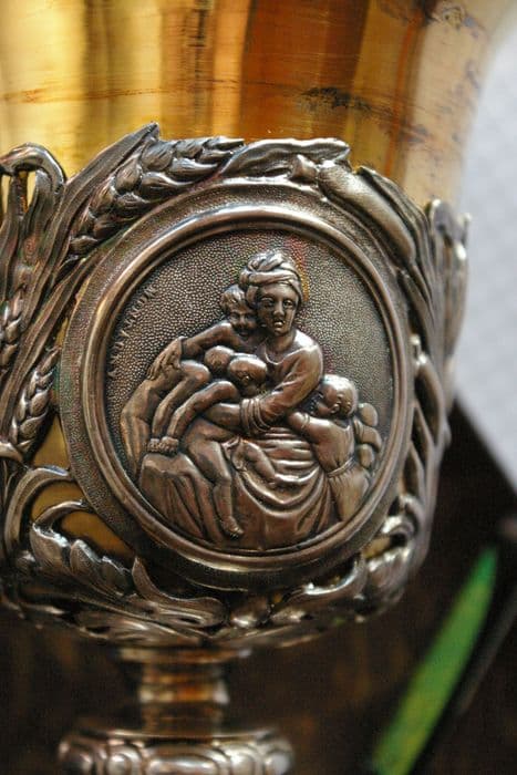 Sur le pied entre deux têtes d'angelots ailées en fort relief, trois scènes se succèdent sur un plan trapézoïdal : le Lavement des pieds, Jésus au jardin des Oliviers et la Crucifixion. Sur la coupe figurent des tableautins représentant les vertus théologales.