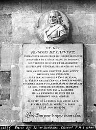 François de Chevert, lieutenant général des armées du Roi, est mort en 1769. Médaillon par Claude-Louis Vassé (1716-1772). L'épitaphe a été composée par d'Alembert. A fait partie du musée des Monuments français, n°402, rendu à l'église sous la Restauration.