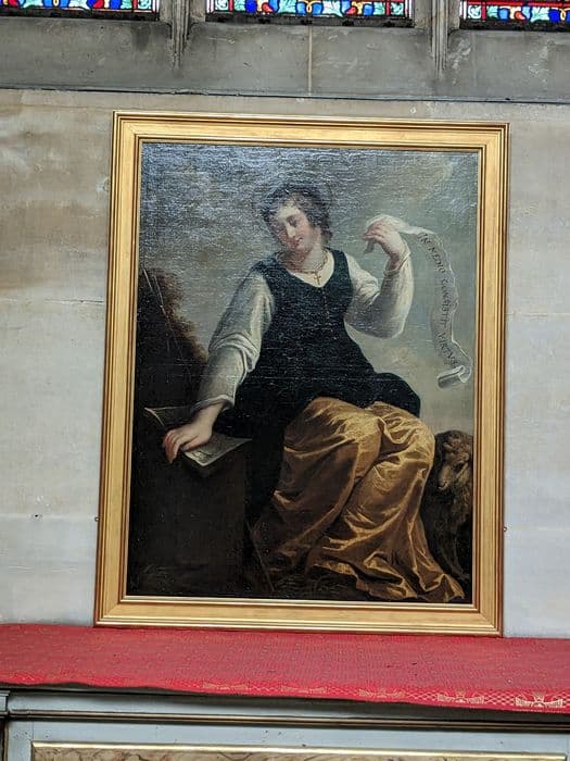 bas-côté droit (fiche protection) ; Sainte Geneviève assise dans la chapelle Sainte-Geneviève (2021)