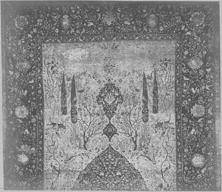 Moitié d'un tapis perse. Au centre, sur fond jaune, un grand médaillon que prolongent deux autres plus petits. Le grand à fond rouge et bordure noire, renferme un semis de fleurs et d'oiseaux ; le second, noir, des fleurs ; le troisième, rouge, des palmettes, fleurs et oiseaux. Sur le fond jaune, quatre cyprès verts et des arbres fleuris à troncs orange et beige, entre lesquels sont figurés des dragons, des lièvres, des cerfs et des léopards ; sur les branches des oiseaux ; les arbres et les animaux sont au naturel ; les dragons sont blancs, roses et bleus. Bordure composée de trois bandes, l'une très large à fond rouge avec palmettes au milieu de rinceaux et d'animaux, une étroite, noire avec fleurs et oiseaux, la dernière, également étroite, verte avec rinceaux jaunes.