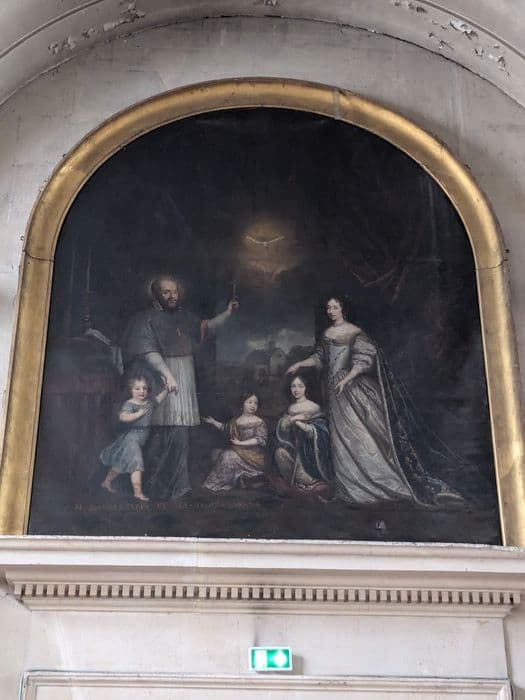 Henriette d'Angleterre, fille de Charles 1er et d'Henriette de France, accompagnée de ses deux filles, voit apparaître saint François de Sales tenant par la main son fils, mort en 1666.