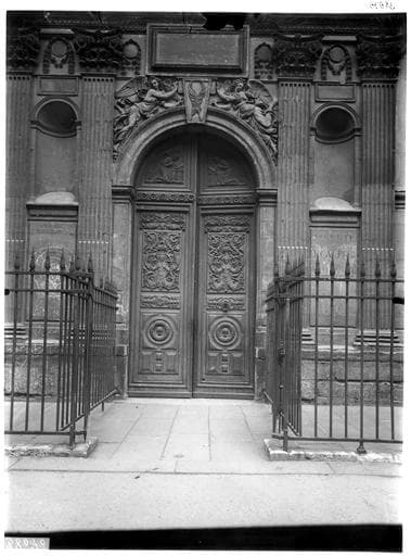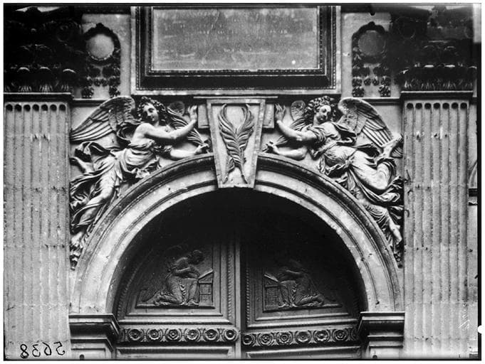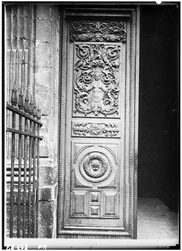 Porte cintrée à 2 vantaux, décorée de panneaux sculptés. Sur le fond des panneaux sont des figures d'anges ailés et agenouillés devant des prie-Dieu.