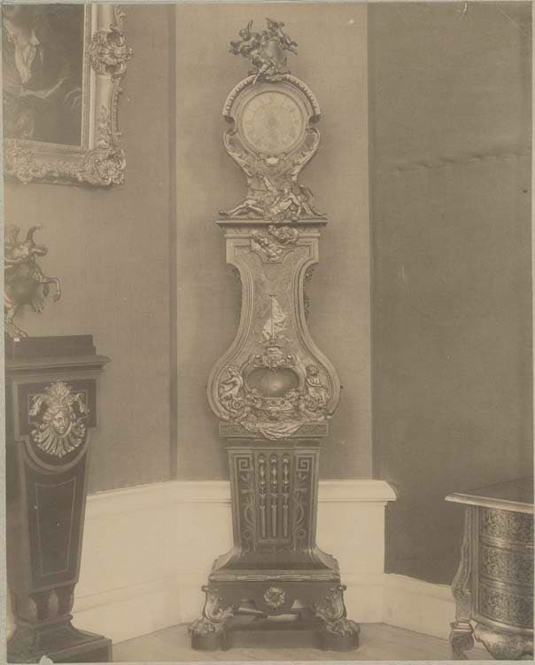 Pendule-régulateur en bois de rose, avec filets d'amarante ; couronnement rocaille en bronze doré. Inv. Ch. XVII, n°4.