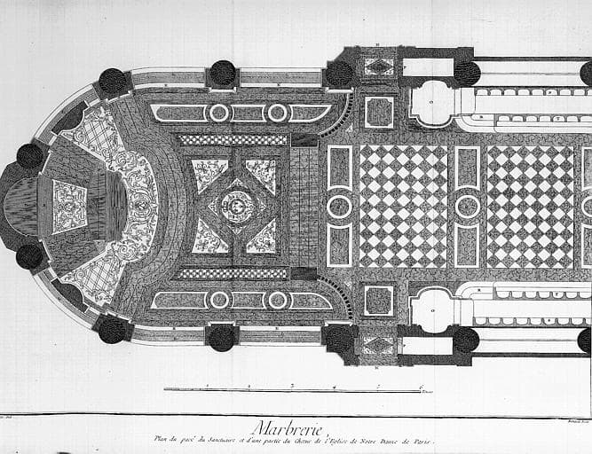 Pavage du choeur, incrusté en marbre de diverses couleurs avec encadrements en marbre gris et blanc, disposés en losanges. Au milieu, dans un losange, les armes de France qu'entoure le collier du Saint-Esprit avec la colombe aux ailes éployées et l'initiale d'Henri III qui institua cet ordre et que surmonte la couronne royale et des lauriers. Dans les parties en triangles que forment le carré : une fleur de lys ornementée. En ordre : à droite et à gauche, une grande bande ornementée à rosaces. On retrouve ce décor de marbres polychromes à la dernière marche du maître-autel, avec au centre SM et sept étoiles.