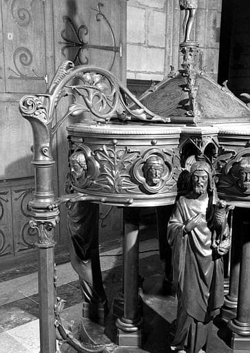 Statuette d'environ 40 cm de haut en ronde-bosse en bronze représentant saint Jean-Baptiste bénissant, vêtu de la tunique de peau. Créé par Louis Bachelet et réalisé par Louis Vuilleinot d’après un dessin de Viollet-le-Duc pour le couvercle des fonts baptismaux sur lequel il a été dérobé. Il était fixé sur un chapiteau qui a été retrouvé désolidarisé du couvercle et mis à l’abri.