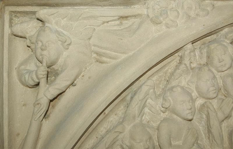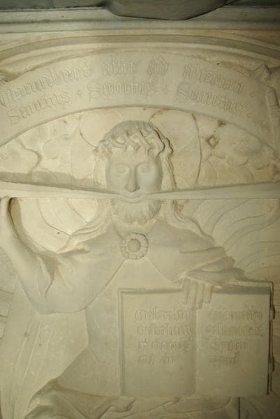 A effigie gravée. On voit en bas le cadavre rongé par les vers ; au-dessus le chanoine sort de son tombeau et paraît, assisté de saint Etienne et de saint Jean devant le Christ-Juge, assis dans une auréole, entouré d'anges, et bénissant. Dans la main gauche, il tient le livre de la vie ; deux épées se croisent sur ses lèvres. De nombreuses inscriptions latines de déroulent sur des phylactères.