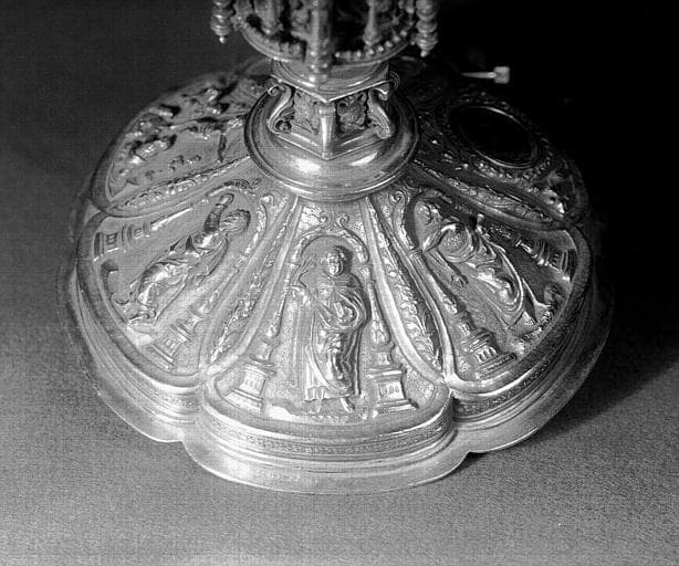 Trésor n°9. Pied à lobes avec Calvaire, saint Jean-Baptiste et moine. Six lobes dont un avec émail. Noeud très ouvragé. Fausse coupe et coupe unie.