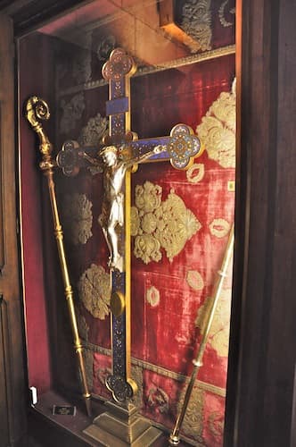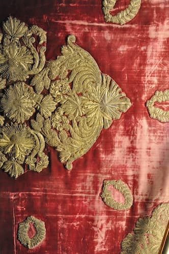 Trésor n°29. Fragments de tissus (restes du manteau du sacre de Napoléon 1er ?, postérieurs) : velours grenat et broderies d'or.