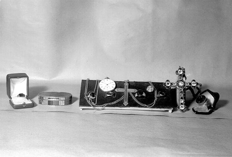 Trésor n°65. Pierres diverses. Le gros anneau appartenait à Mgr Guibert. Celui sous scellés, à Mgr Darboy (exhumé). Croix et chaîne de Mgr Morlot. L'anneau de Mgr Baudillart proviendrait de Mgr de Juigné (1781-1801). Croix de Mgr Amette. Montre de Mgr Affre en or, donnée sur son lit de mort à Pierre Sellier, 27 juin 1848. Anneau de Mgr Surat, protonotaire apostolique. Anneau de Mgr Sibour (et sa croix pectorale ?).
