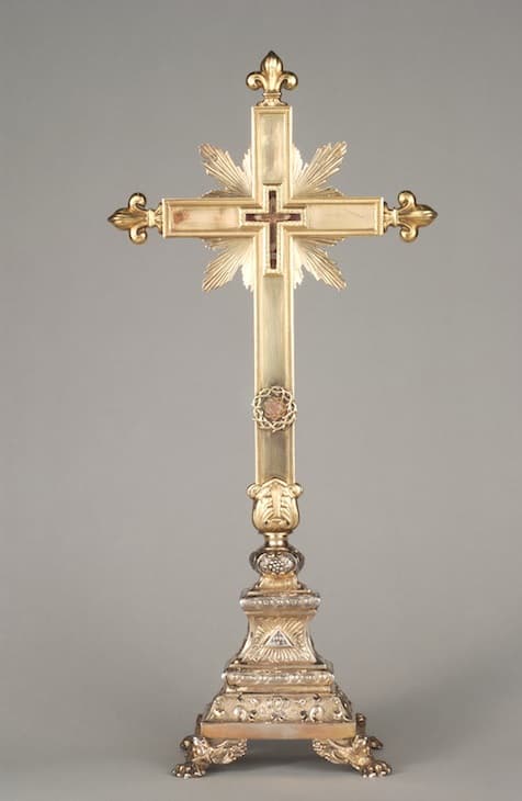 De face : deux vitrines, l’une avec couronne d’épines et relique, l’autre avec croix et relique à l’intersection (trois fragments de bois, inscription sur un petit parchemin (?) « ex crucis » (sic) ; rayons, fleurs de lys aux trois extrémités. Le réceptacle cruciforme s’ouvre au revers ; fils rouges d’authentique cachetés (h. 6,4 cm). Sur quatre griffes. Pied rectangulaire avec quatre frises et quatre pans dont deux avec delta dans les rayons. Haute tige avec frise de raisins : cette partie est fin XIXème alors que la croix proprement dite est début XIXème. Feuilles d’acanthe à la base, branches plates. £Poinçons : deux au revers (branche plate), un de l’orfèvre Paraud et un poinçon de recense, plus deux sur les rayons de face à droite et à gauche : tête de Cérès et tête de vieillard (= poinçon de titre et garantie, entre 1819 et 1838). Sur la base, Minerve (= à partir de 1838) et poinçon de maître : Vve Brigaud. £La croix et le pied n’ont pas la même origine (montage).