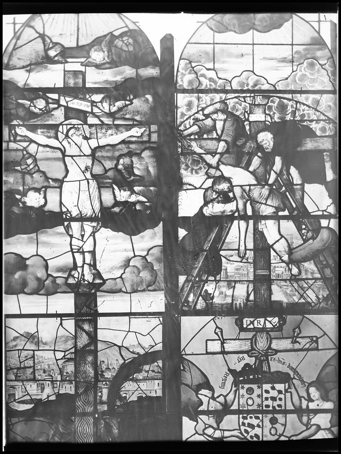 Le Christ en croix et Descente de croix, au-dessus dans la lunette, le Lavement des pieds. Verrière en 2 compartiments.