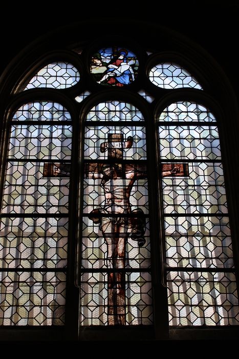 Le Christ en croix, vitrail en grisaille exécuté vers 1570. La Vierge de Pitié, médaillon exécuté vers 1550. Anciennement datée du 17e siècle.