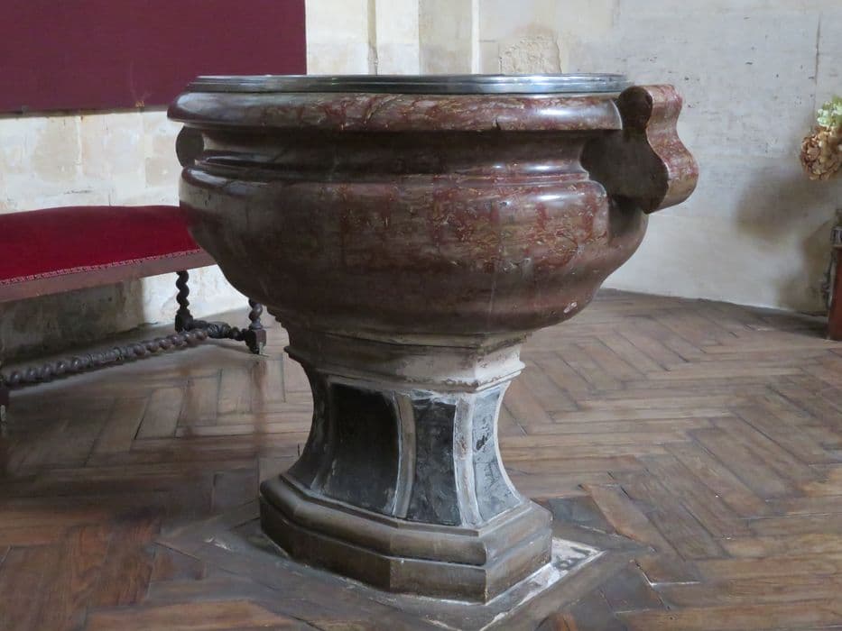 Cuve baptismale, anciennement décrite comme étant en bois sculpté.