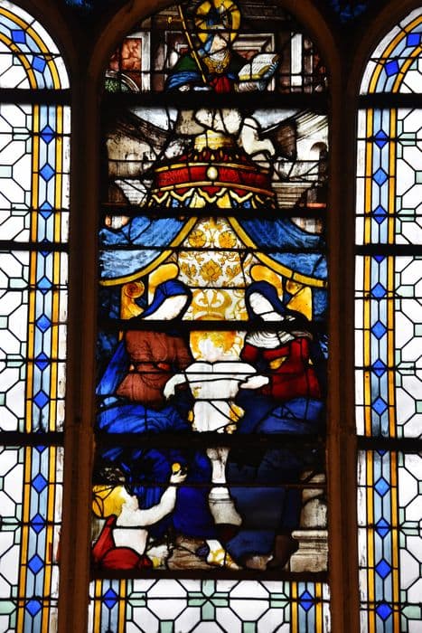 verrière de la chapelle Saint-Joseph : L'Enfant Jésus entre la Vierge et sainte Anne, un évêque, têtes de chérubins