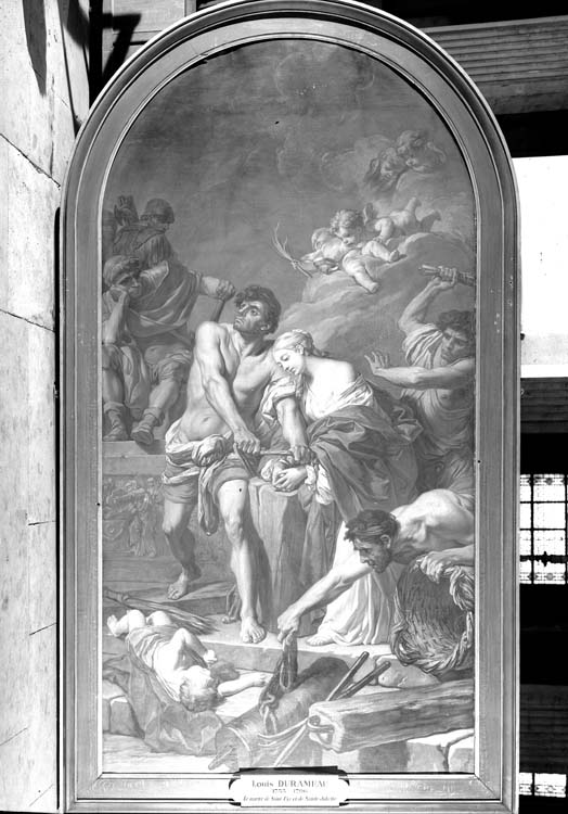 Louis Durameau (Paris 1733-Versailles 1796) : élève de J.-B. Pierre, prix de Rome en 1757, agréé à l'Académie royale en 1866 et reçu membre en 1774. En 1783, il fut nommé garde des tableaux du Roi à Versailles. Il est l'auteur du plafond de l'Opéra de Versailles. Salon de 1767, n°156 ou 157 ; chapelle de la maison royale de Saint-Cyr ; Mairie de Saint-Cyr ; Muséum central ; dépôt en 1804 à Saint-Nicolas-du-Chardonnet.