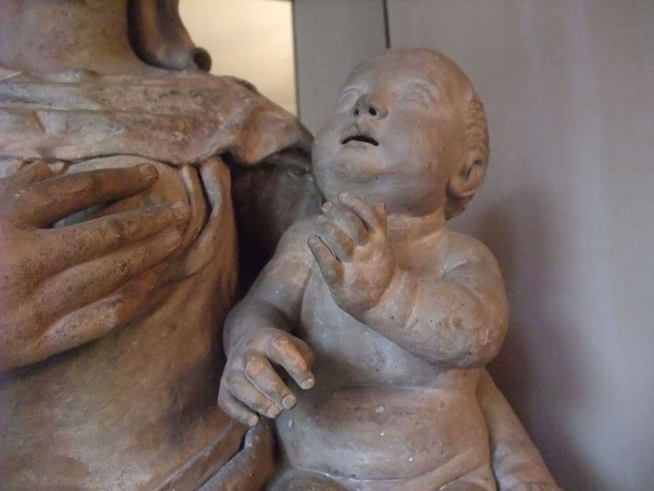 Traces de la polychromie originelle sur le bras gauche de la Vierge et sur sa chevelure.