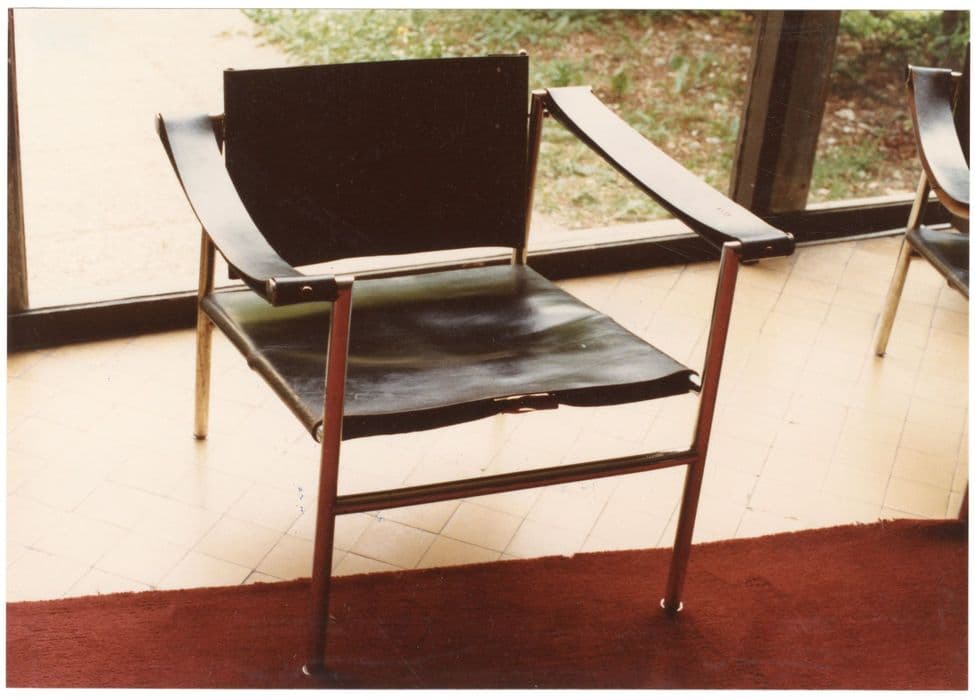 Banquette à laquelle s'attache une petite table (fonctions combinées), bois, fer, revêtement en plaques de céramique, et 10 fauteuils, aluminium et cuir.