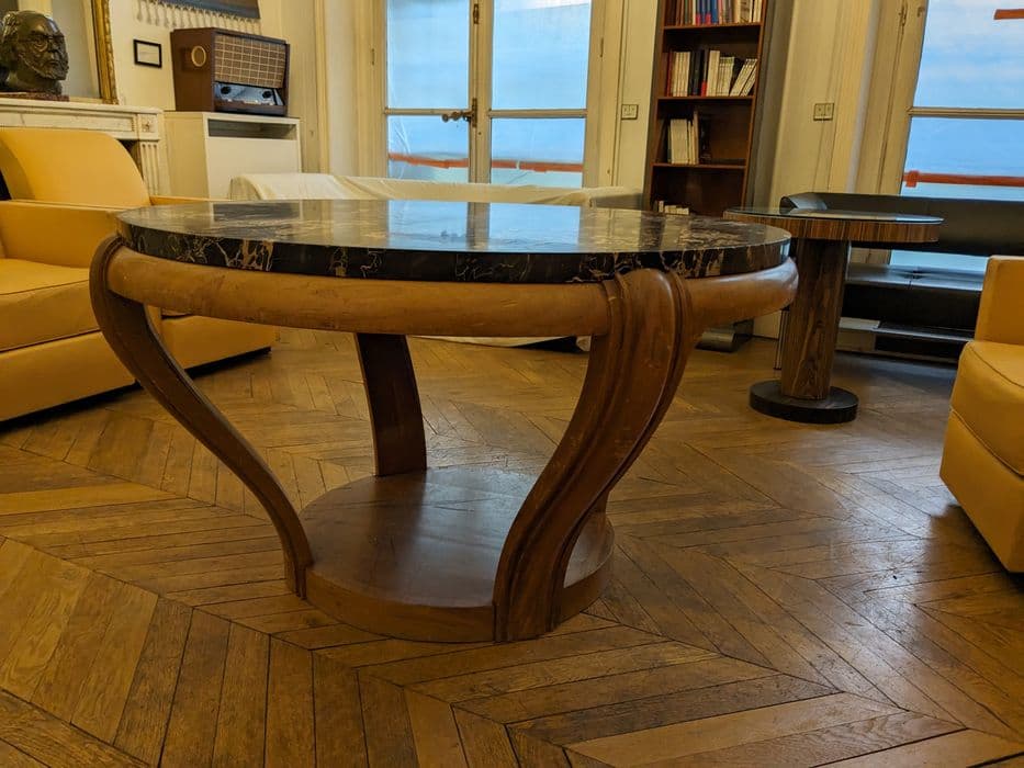 Inventaire 80.M.25. Loupe de thuya, dessus de marbre Portor (?). Assortie au canapé (PM75003210), aux deux fauteuils (PM75003211) et à l’armoire (PM75003235).