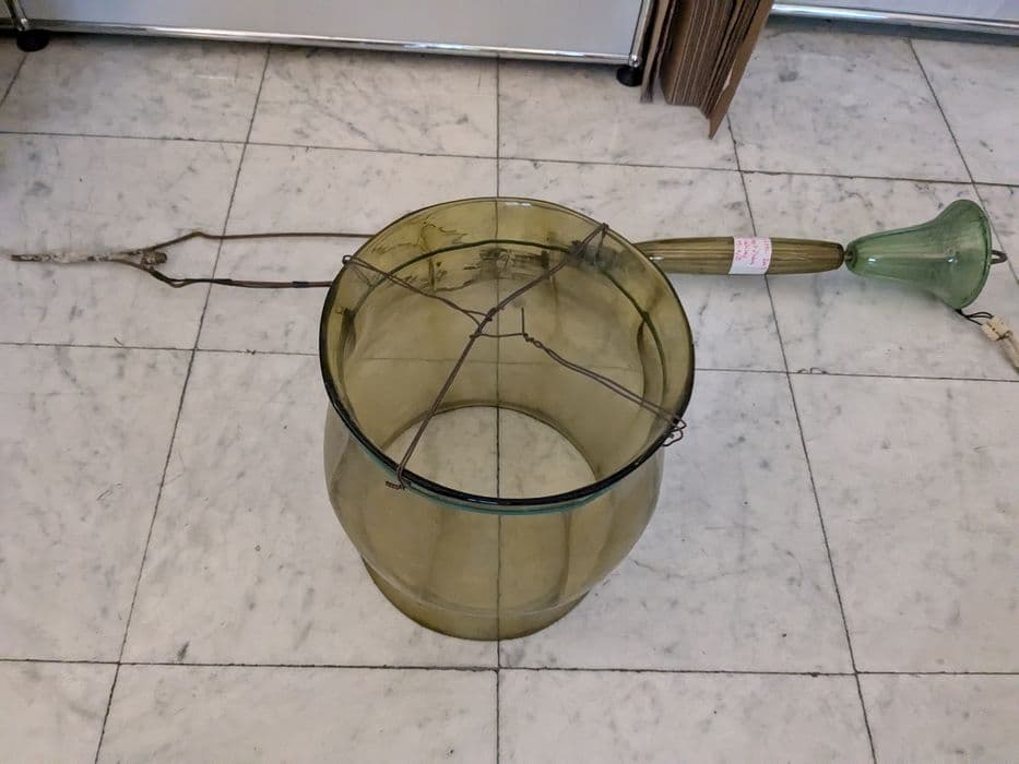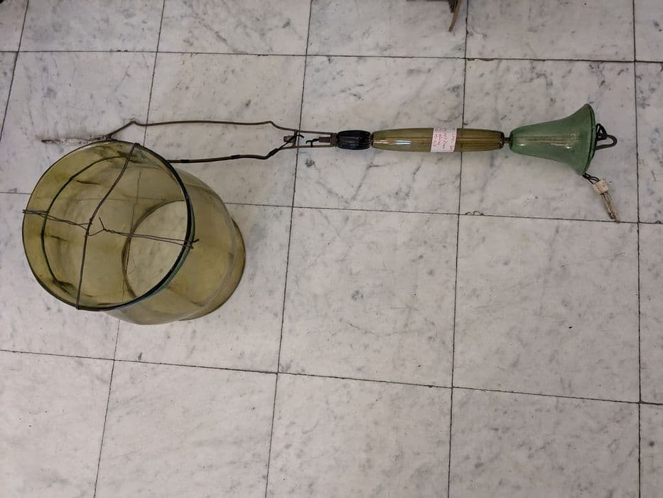 Inventaire 80.M.10. Lanterne en verre, couleur moutarde, pendeloques vertes.