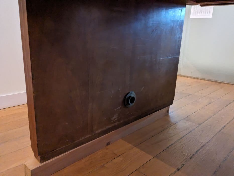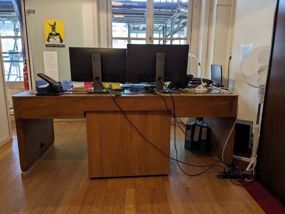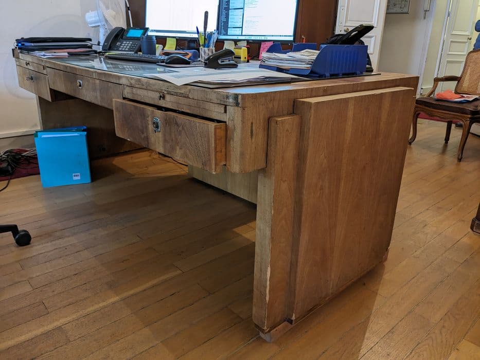 Inventaire 80.M.37. Bureau avec barre métallique sous les pieds. Bois plaqué (noyer).