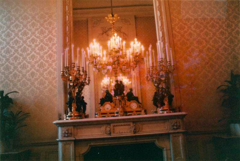 Garniture de cheminée : pendule-calendrier, dont les bronzes symbolisent les Ages de la vie ; les candélabres symbolisent les Eléments.