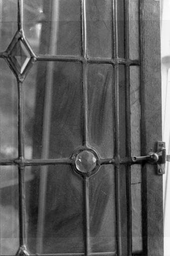 L'ensemble est constitué de six volets intérieurs à fond de vitrail (plomb et verres de couleurs). Le châssis est en bois, et les les loquets et pattes sont en fer.