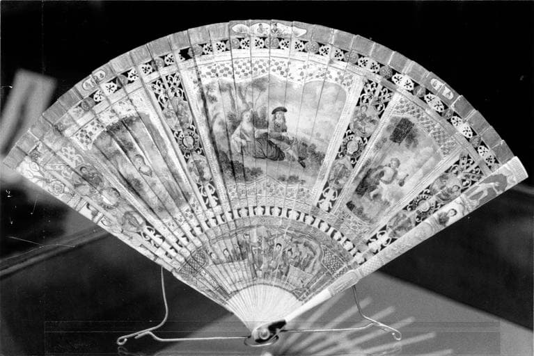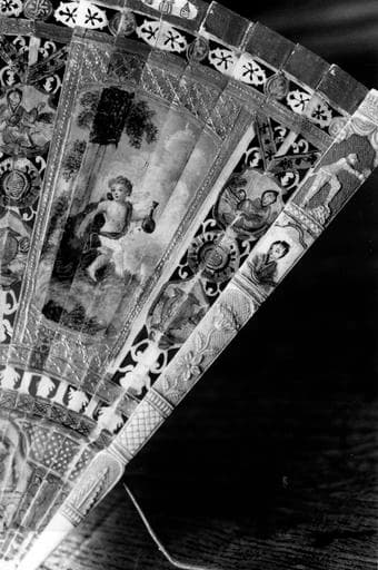 Eventail composé de 28 brins (et deux panaches), formant un brisé, ivoire, gouache et vernis.
