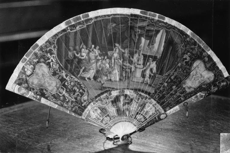 Eventail composé de 28 brins (et deux panaches), formant un brisé, ivoire, gouache, vernis de Paris, écaille jaspée, strass d'émeraude et ruban.