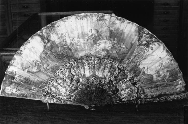Eventail composé de 22 brins (et deux panaches) et feuille pliée, écaille brune (de tortue), or, peau de cygne doublée de papier, gouache (partiellement vernie).