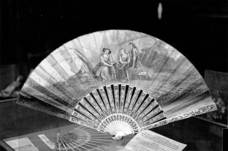 Eventail composé de 16 brins (et deux panaches) et feuille pliée, ivoire, vélin, gouache (et aquarelle ?). Montage à l'anglaise (vélin d'un seul tenant).