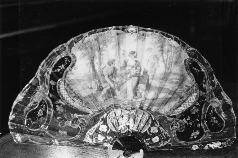 Eventail composé de 16 brins (et deux panaches) et feuille pliée, écaille brune, nacre blanche et burgau, peau de cygne, organza noir et paillettes (centre des volutes).