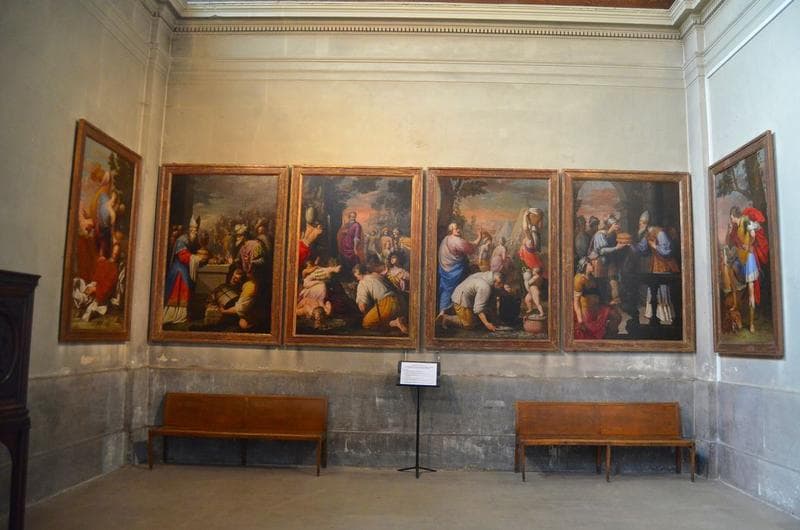 Les scènes représentées sont tirées de l'Ancien Testament. Elles déclinent le thème de la nourriture céleste, symbole de présence divine et signe de sa reconnaissance. Chaque épisode préfigure en outre la mort du Christ et sa Résurrection ainsi que l'Eucharistie. Cet épisode suit de près celui de la Manne. Moïse obéissant à Dieu, frappe un rocher duquel jaillit de l'eau pour désaltérer son peuple assoiffé. ces deux épisodes sont communément vus comme préfigurant l'Eucharistie.