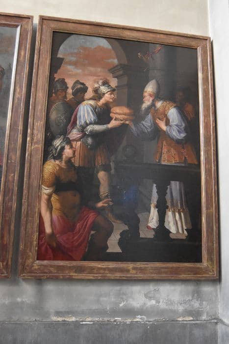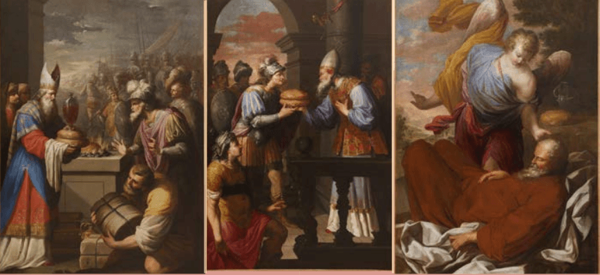 Les scènes représentées sont tirées de l'Ancien Testament. Elles déclinent le thème de la nourriture céleste, symbole de présence divine et signe de sa reconnaissance. Chaque épisode préfigure en outre la mort du Christ et sa Résurrection ainsi que l'Eucharistie. Le livre de Samuel nous relate la rencontre entre David et Abimélech. David entre dans le temps en quête de nourriture pour lui et ses hommes et reçoit du prêtre du pain consacré à Dieu.