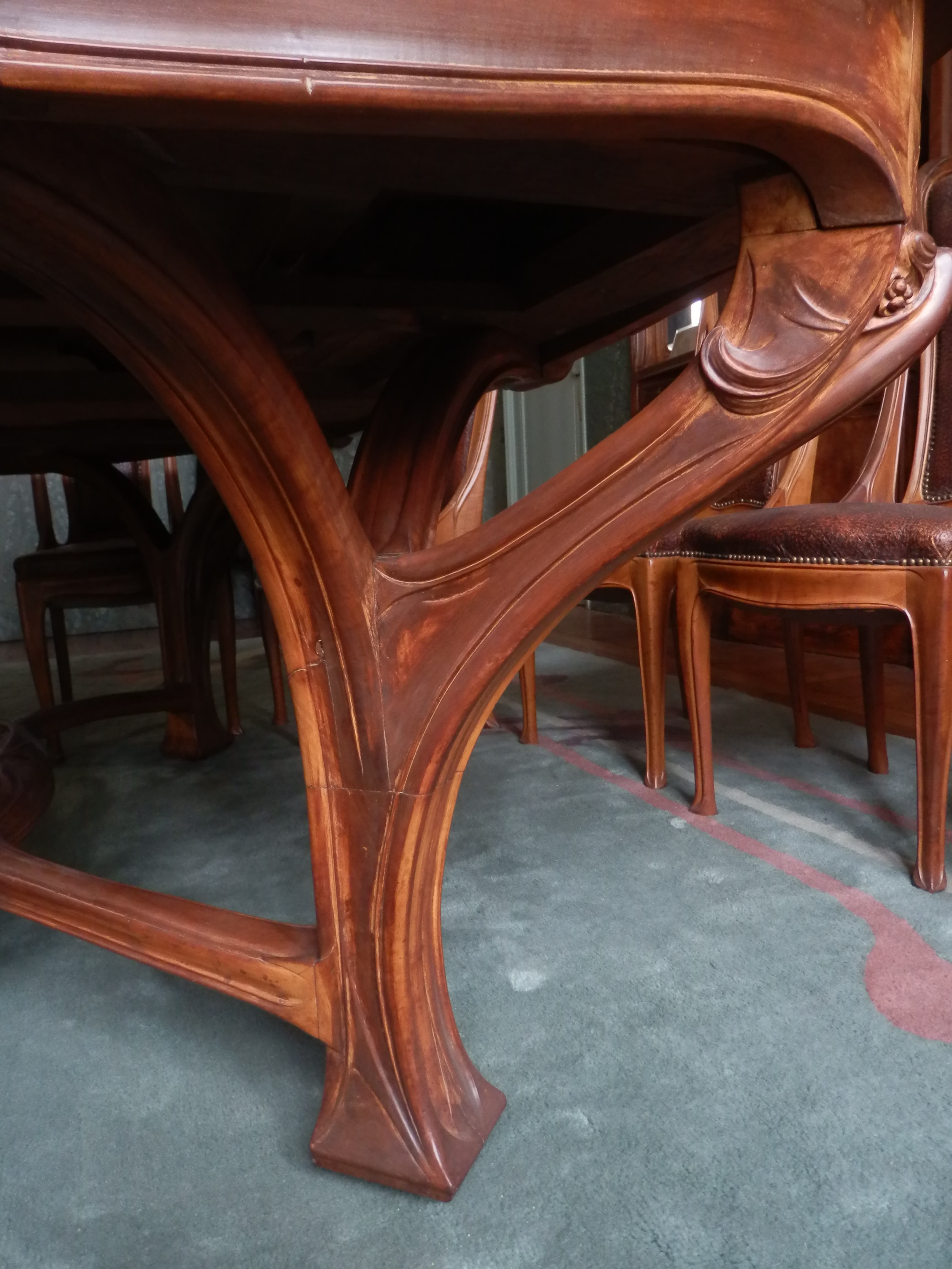 Table rectangulaire à allonges avec pieds rabattables ; plateau constitué de 6 planches ceinturées d'une bande arrondie aux angles ; 4 pieds avec entretoise.