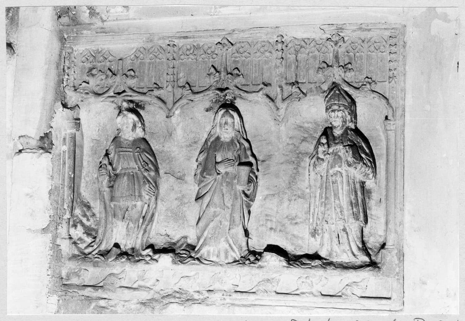 demi-relief (triptyque) d'un décor de fenestrages : Saint évêque, sainte Madeleine et un autre personnage