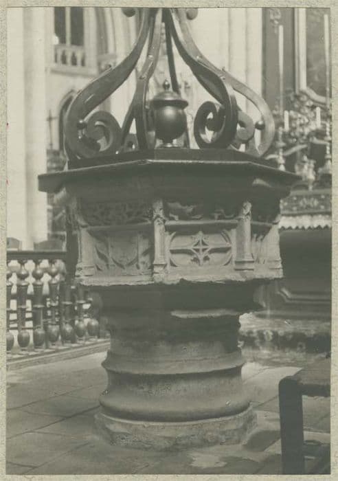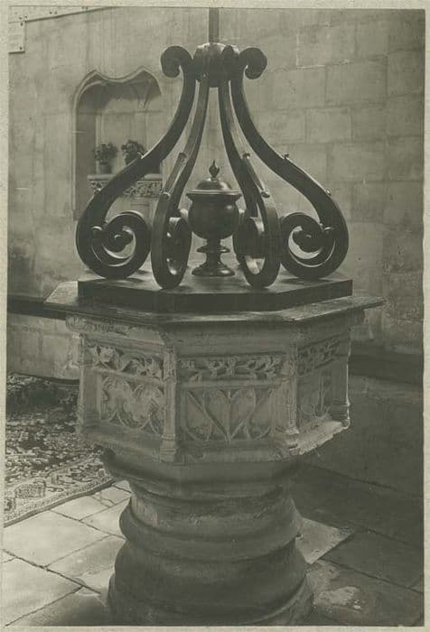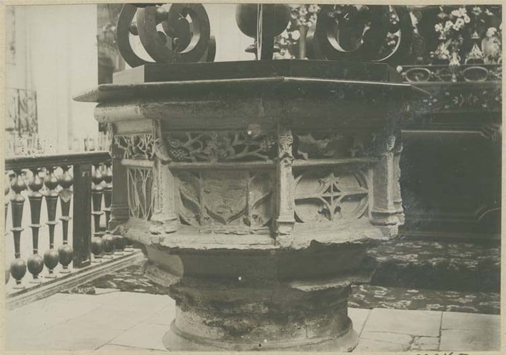 cuve octogonale, chaque pan est décoré de fenestrages flamboyants sous une frise de feuillages et séparé des autres par un clocheton