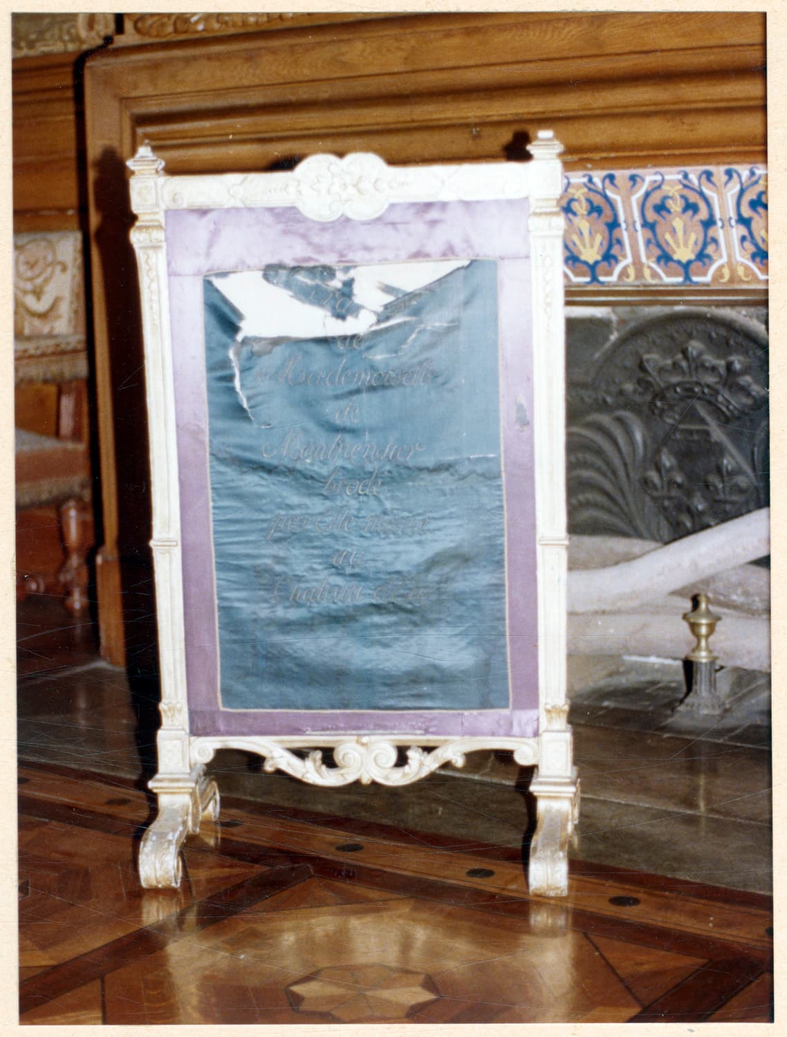 piétement en forme de volute orné de feuilles. cadre rectangulaire décorée de fleurons. tissu de soie brodé