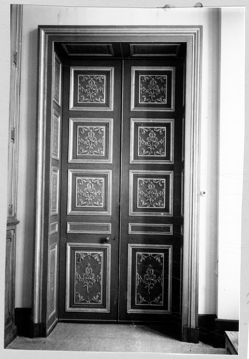 double porte et ébrasement formé de panneau mouluré peint. chambranle mouluré