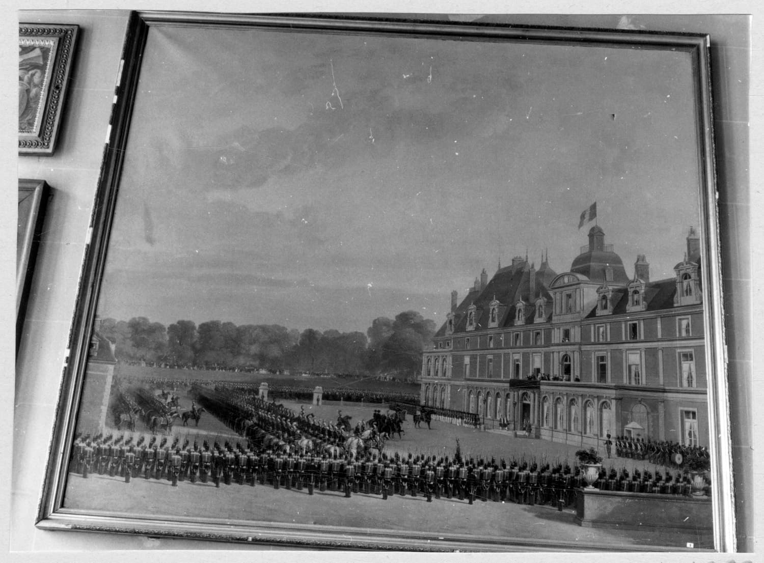 sur le balcon du château d'Eu Louis Philippe présente la reine Victoria à la population eudoise. devant le château présentation de cavaliers et de soldats